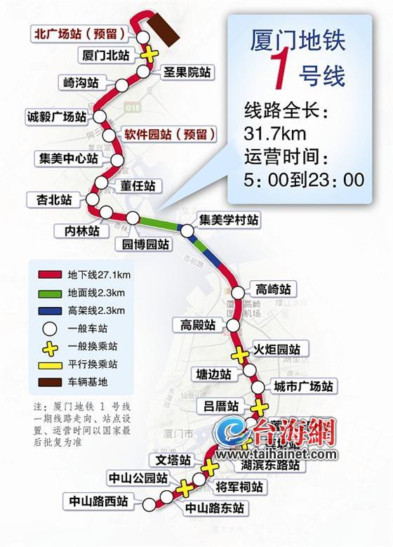厦门地铁1号线一期,拟设24个车站,预计2016年12月31日全线通车试运营,每天从5:00到23:00,几分钟就有一班。