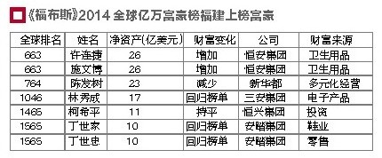 《福布斯》2014全球亿万富豪榜福建上榜富豪