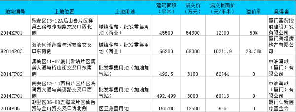 此外,中油海峡底价竞得2014JP02、2014TP01两幅批发零售用地;建发底价竞得本次土拍唯一岛内地块——2014P05。