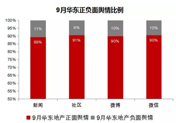 截至9月,华东地区房地产业负面舆情信息在新闻、社区、微博、微信中,各占到11%、9%、10%、10%。但来自传统媒体的监督报道比例却在上升,可以看出在房地产主流舆论场中,传统媒体的监督属性暂时还不会被其他各种类型媒体所替代。