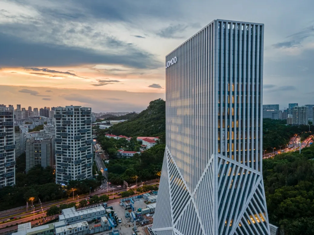 大楼外立面创新性地结合了玻璃幕墙与大型陶板线条,单根陶板截面尺寸600mm×600mm,这种设计不仅在视觉上极具冲击力,同时也兼顾了效率与独特的光影效果。底部的裙楼部分由21个角度各异的三角形玻璃幕墙构成“裙摆”造型,辅以不同倾角的陶板线条,整体灵动而富有韵律感,展现出科技与自然的和谐共生。