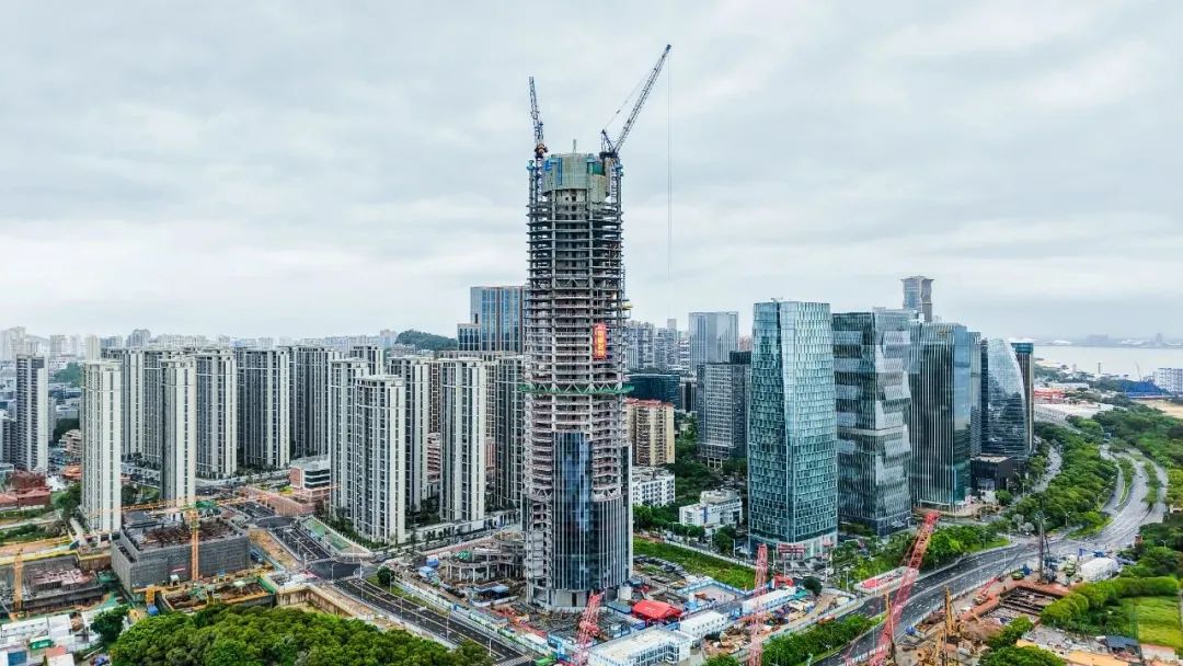 中建八局厦门国际银行新总部大厦项目总工程师郝黎明介绍,项目施工过程中,应用“天泵+溜管+溜槽”联合浇筑技术,尤其在垂直运输方面,采用自主研发的首台外挂式自爬升塔吊。这一塔吊打破了传统外挂式塔吊爬升需占用另一台塔吊的技术壁垒,通过装配式连接避免了高空焊割,大幅提升了爬升效率及安全性。