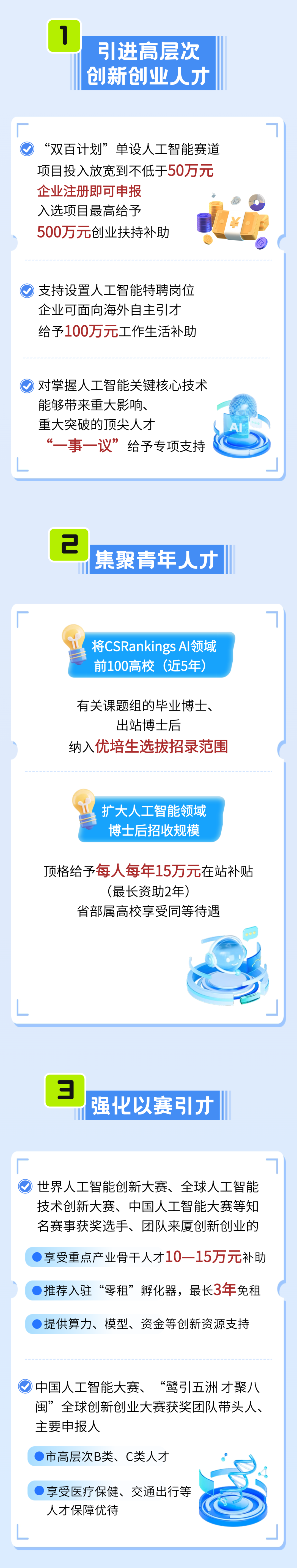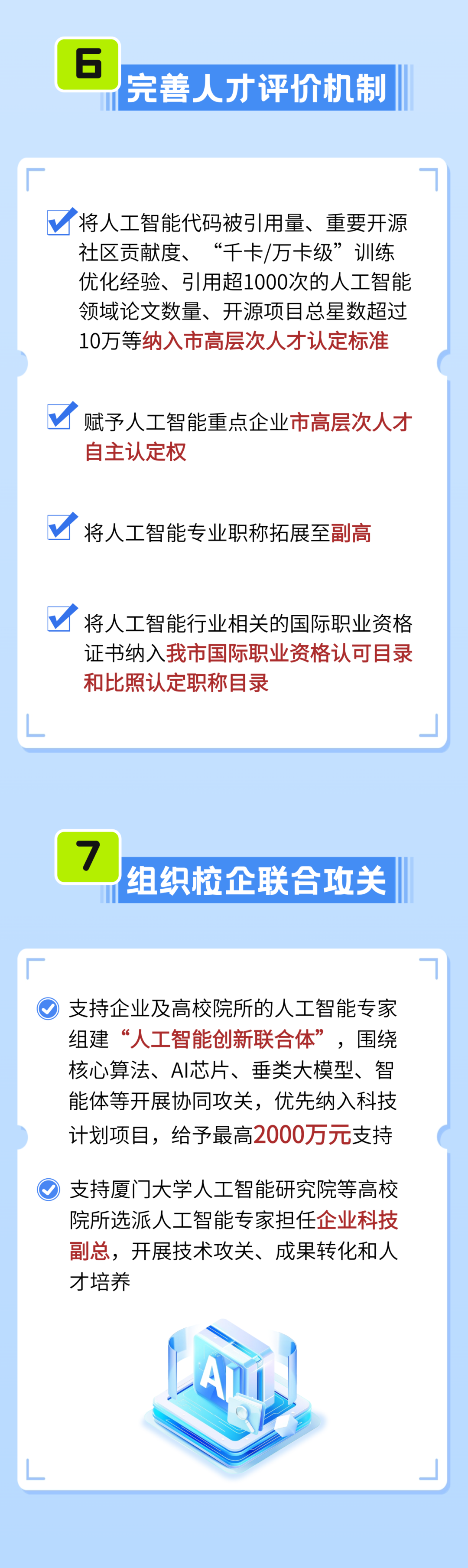 收藏 厦门出台实施“AI产业人才8条”!多项补助 发布时间:08-15 19:23 分享到: 为吸引集聚人工智能产业发展急需紧缺人才,支持人工智能产业实现核心技术突破、规模能级提升、生态要素集聚,厦门市出台实施“AI产业人才8条”,围绕人才引进、培养、评价、激励等方面出台支持举措,以人才支撑助力产业高质量发展。来源:厦门市高层次人才、投资厦门... 为吸引集聚人工智能产业发展急需紧缺人才,支持人工智能产业实现核心技术突破、规模能级提升、生态要素集聚,厦门市出台实施“AI产业人才8条”,围绕人才引进、培养、评价、激励等方面出台支持举措,以人才支撑助力产业高质量发展。来源:厦门市高层次人才、投资厦门